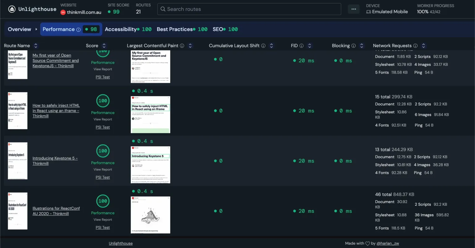 Thinkmill ran their Astro site through Unlighthouse, which runs every page through Lighthouse. Almost every page scored 100 for performance, best practices, SEO, and accessibility.
